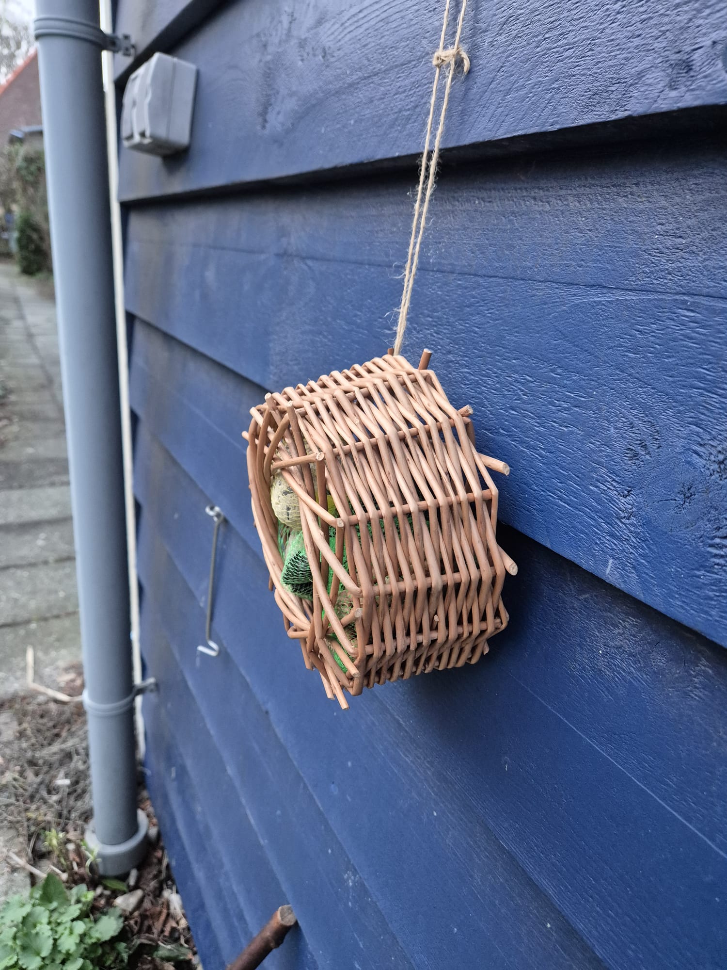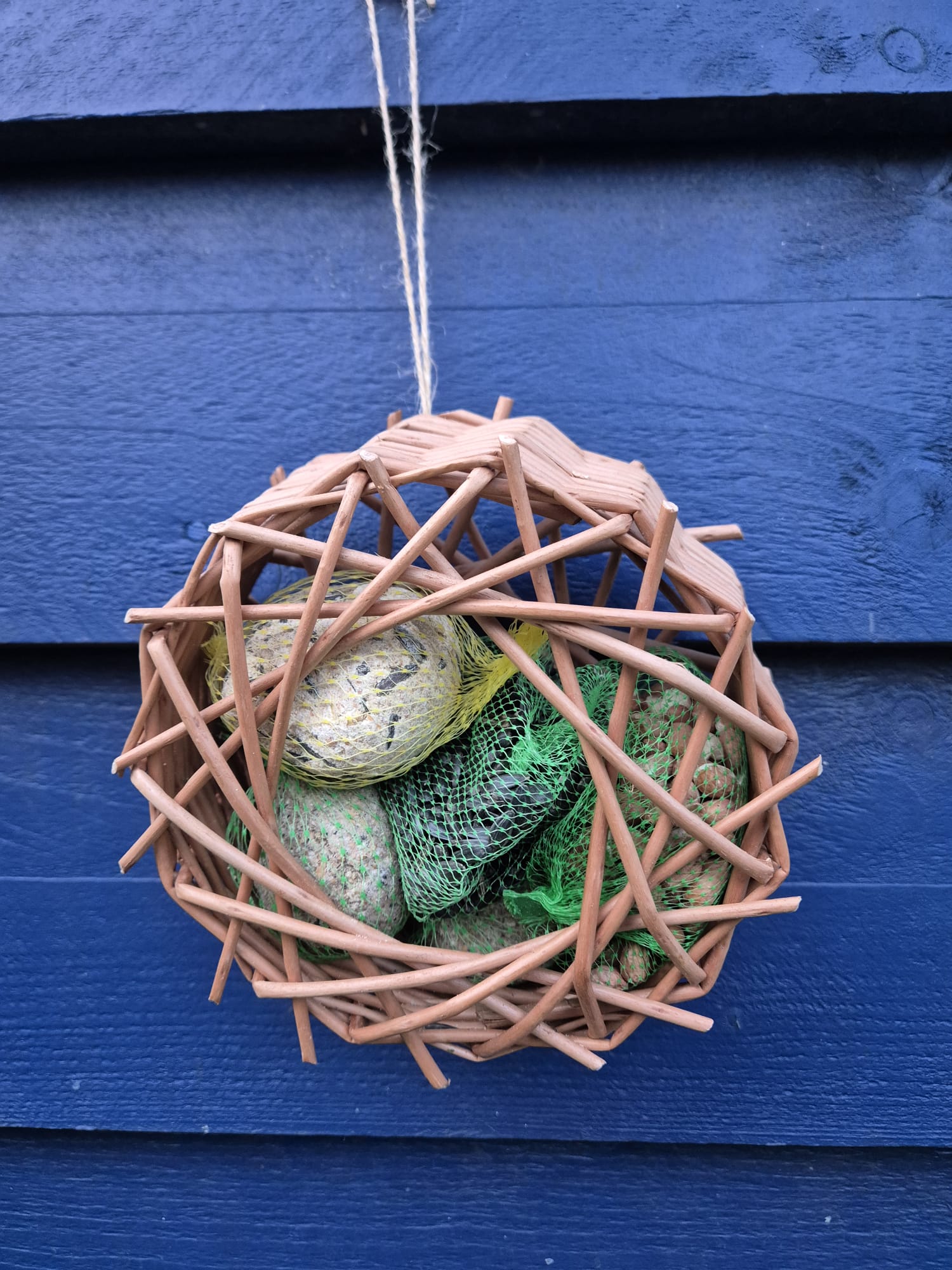 We maken van wilgentenen een mandje dat nu te gebruiken is om mezenballen en ander vogelvoer in te doen.