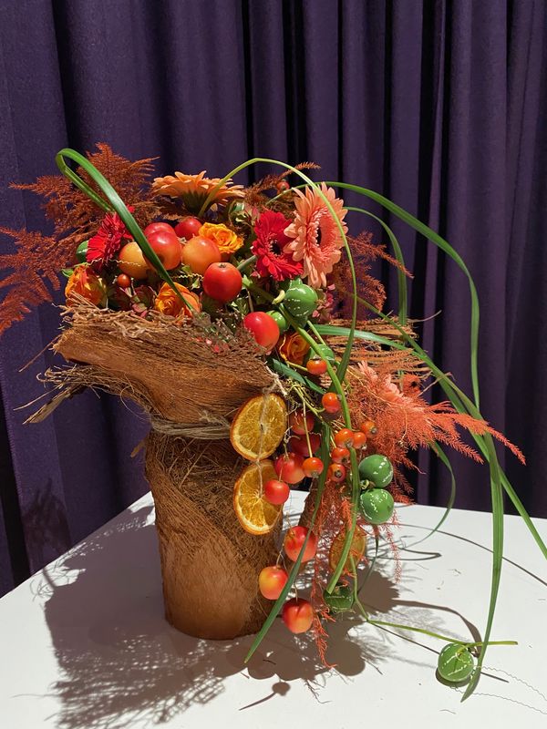 Het najaar biedt zoveel mooie materialen aan de bloemschikker. We maken dit rijke stuk, omsloten door kokosvellen.
