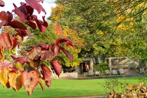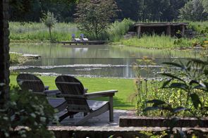 De tuin is zeer groot en bestaat uit zeer verschillende delen. Eyecatcher is de grote natuurlijke vijver, er is een wandelpad van 2 km, meerdere poelen, een vleermuizengrot en nog veel meer.