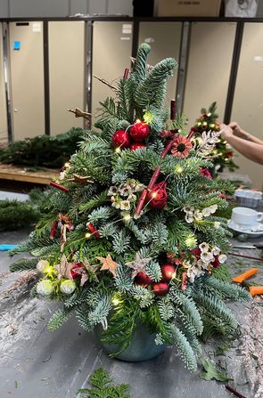 Dit jaar hebben we een kleurrijk mini-kerstboom bloemwerk gemaakt.