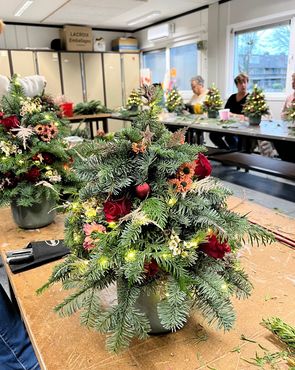 Vorig jaar stond in maandblad Groei & Bloei een voorjaarsstuk ontworpen door Lily Beelen. Dit voorbeeld hebben we voor onze voorjaarsworkshop als uitgangspunt genomen maar uiteraard legden onze cursisten hun eigen creativiteit erin!